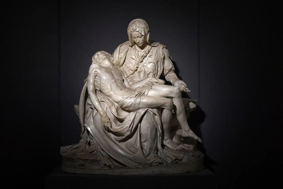 Pietà do Vaticano, feita entre 1498 e 1499, quando ele tinha menos de 25 anos, surpreendeu seus contemporâneos, deslumbrados com a beleza humilde desta Virgem em prantos, cujo corpo está envolto em um hábil conjunto de tecidos.
