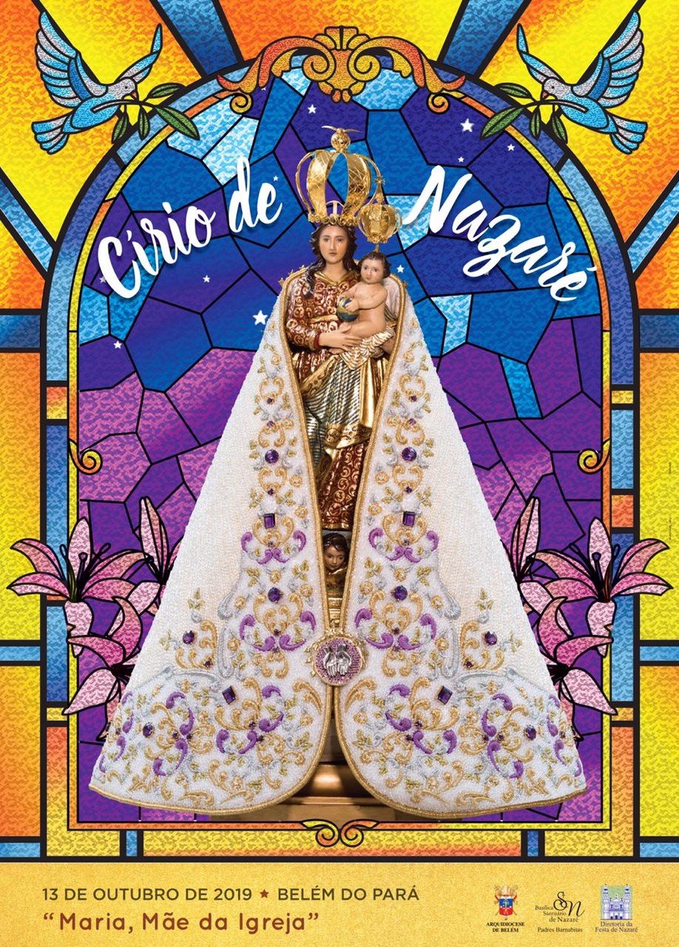 A cada ano, os cartazes do Círio são produzidos para distribuição à população, que tem por hábito afixar nas portas de suas casas, como uma homenagem daquele lar à padroeira. Este ano, representa a beleza e a simplicidade com que Deus age na vida do seu povo. É necessário estarmos em sintonia com Ele para percebermos a sua ação em nossas vidas. Em primeiro plano contemplamos a Virgem de Nazaré que traz nos braços o nosso Salvador. Por detrás da imagem peregrina as fitinhas coloridas tão intimamente ligadas à nossa devoção popular, compõem de maneira harmoniosa um belíssimo resplendor que imediatamente evoca os raios de um ostensório, objeto litúrgico usado para a Adoração do Santíssimo Sacramento. Maria é a Mulher Eucarística porque nos apresenta seu filho Jesus e convida-nos a viver em perene ação de graças por tudo o que d’Ele recebemos.