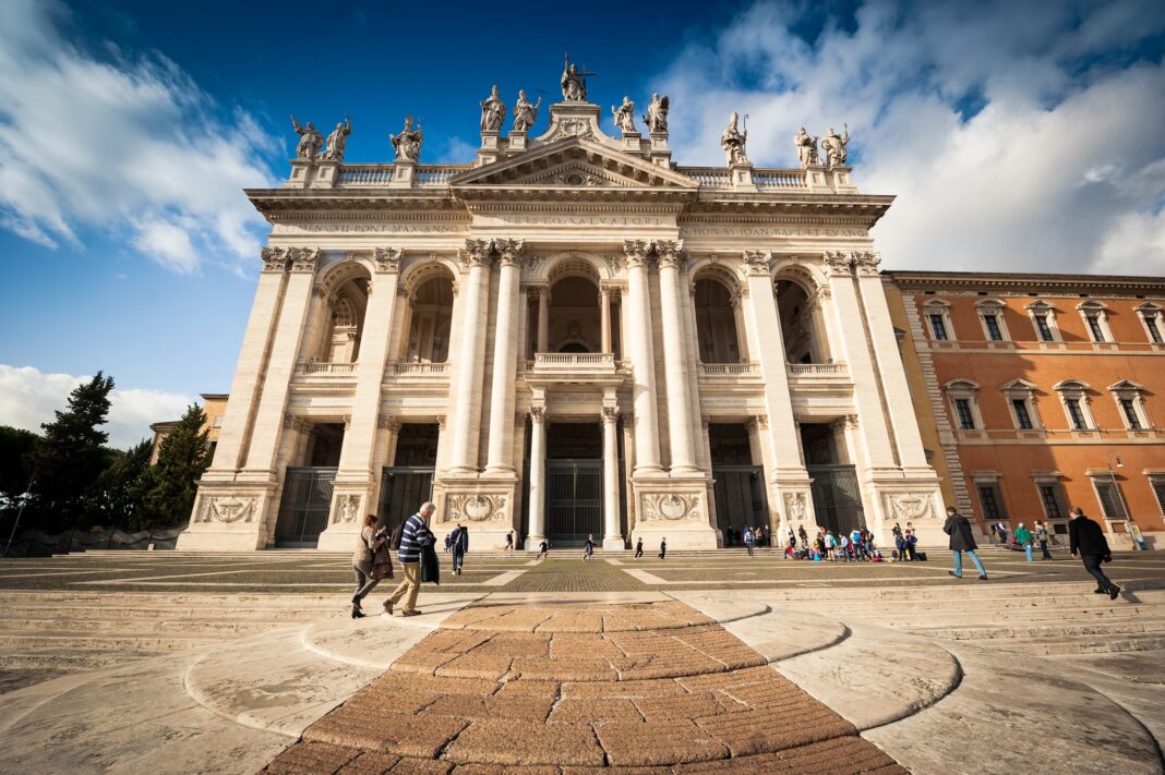 A Basílica de São João de Latrão, cujo nome completo em latim é Archibasilica Sanctissimi Salvatoris et Sanctorum Ioannis Baptistae et Evangelistae in Laterano, foi o primeiro templo cristão público construído em Roma após o Édito de Milão, promulgado em 313 d.C., quando o imperador Constantino concedeu liberdade de culto aos cristãos. A basílica foi consagrada em 324 pelo Papa Silvestre I e inicialmente dedicada ao Santíssimo Salvador, sendo posteriormente também consagrada a São João Batista e São João Evangelista, passando a ser conhecida como Basílica de São João de Latrão. O termo “Latrão” vem da antiga família Laterani, que possuía o terreno onde Constantino mandou erguer a basílica e o palácio anexo — o Palácio de Latrão —, que durante mais de mil anos serviu como residência dos Papas antes da transferência para o Vaticano.