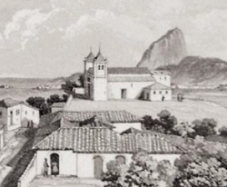 Pintura de Johann Jacob Steinman, 1839. Vê-se o topo do Morro do Castelo. À esquerda vê-se a torre da Igreja de Santo Inácio e parte do Colégio dos Jesuítas; o arco pertencia ao Observatório. À direita a Igreja de São Sebastião. Observe as duas torres bem nítidas, antes da reforma de fins do século XIX e a ausência do Convento dos Capuchinhos. (Do site: “Histórias e Monumentos”)