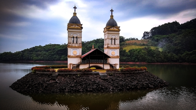 As torres e a cúpula de uma igreja – apenas elas – ilhadas em uma represa: é o cenário que intriga os visitantes da antiga cidade submersa de Itá, no estado de Santa Catarina.