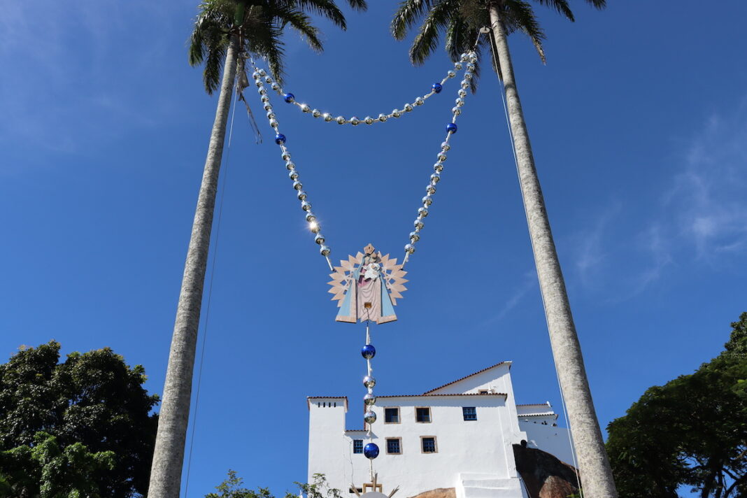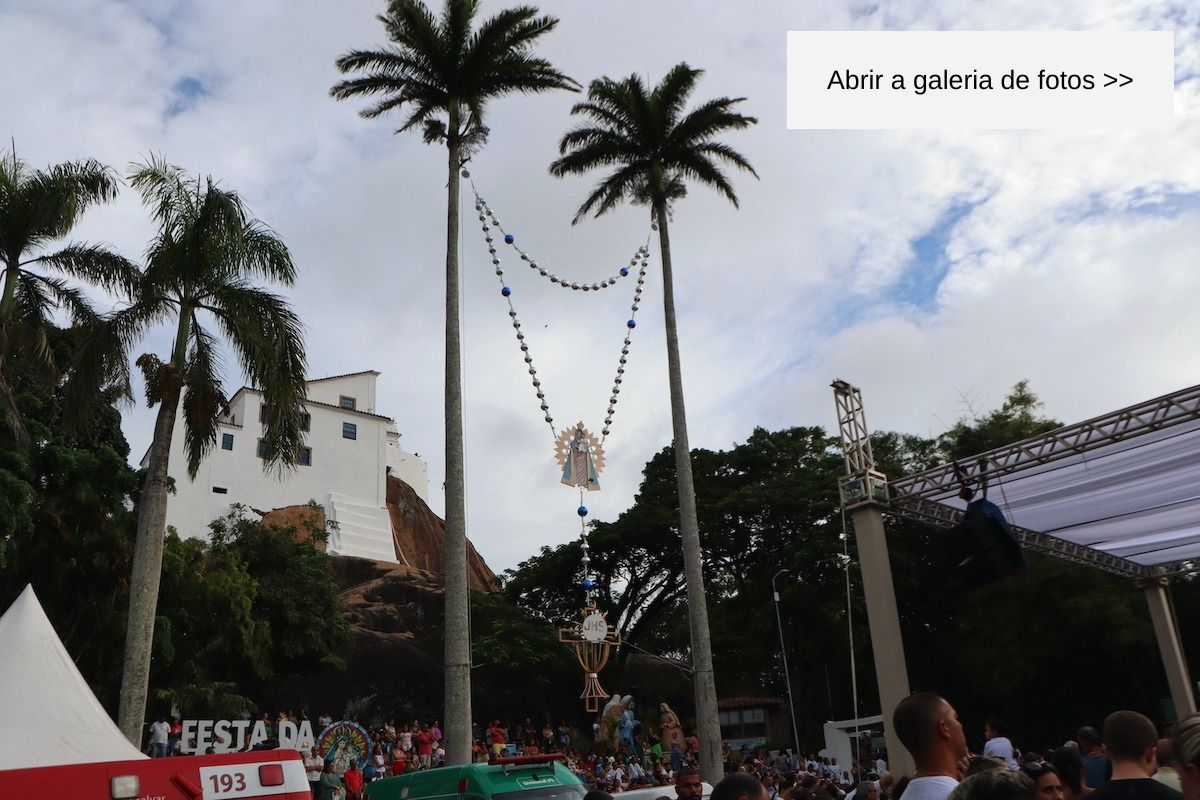 Do alto dos seus 20 metros, o terço gigante instalado entre duas palmeiras imperiais do Campinho do Convento da Penha, em Vila Velha, ES, demonstra um pouco da grandeza da devoção que ele representa. O terço anuncia também a festa de Nossa Senhora da Penha – o maior evento religioso do estado, que se repete há 453 anos.