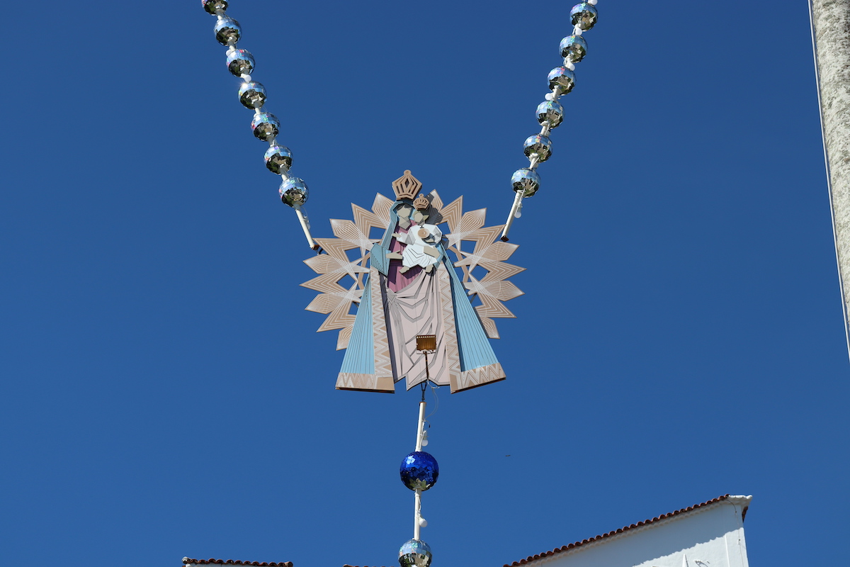 Erguido entre as palmeiras do jardim de um convento, o terço tem cerca de 20 metros de cumprimento