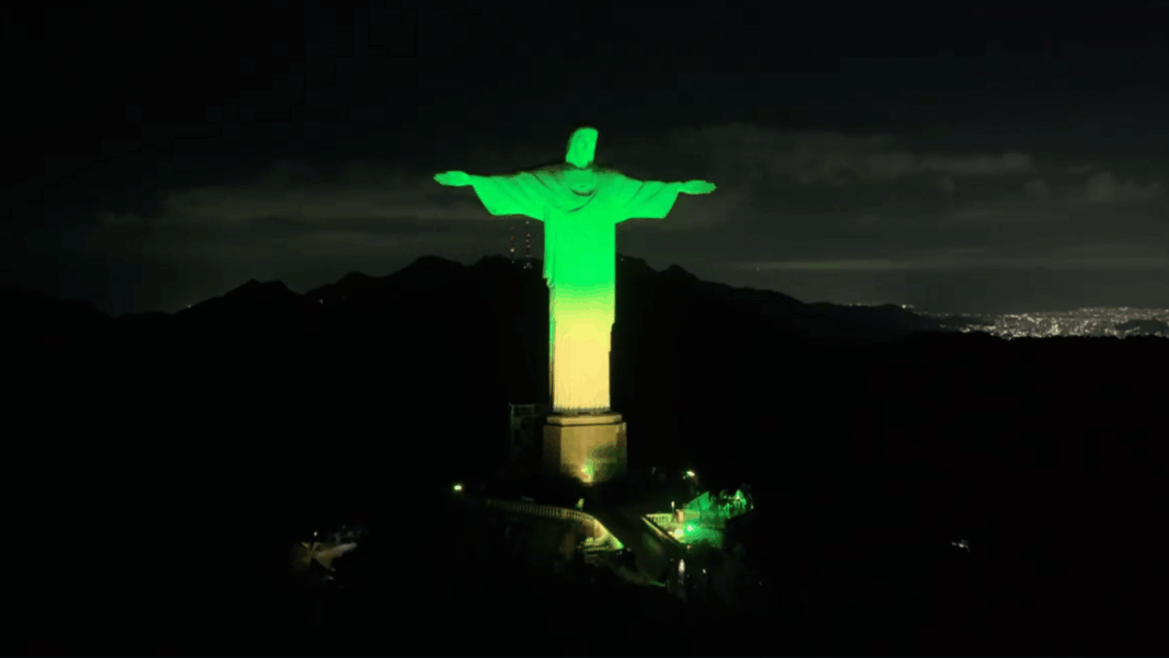 O Cristo Redentor foi iluminado em verde e amarelo na noite desta sexta-feira, 23, em homenagem ao bicentenário das relações diplomáticas entre o Brasil e a Santa Sé.