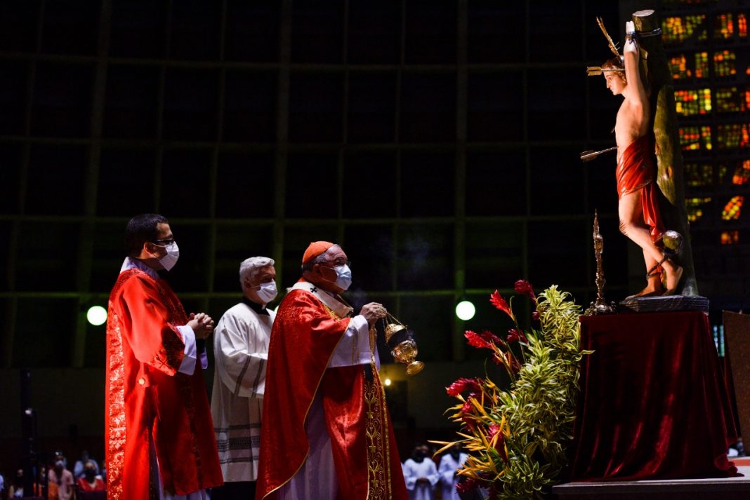 Dom Orani incensa a imagem de São Sebastião durante missa solene do padroeiro.