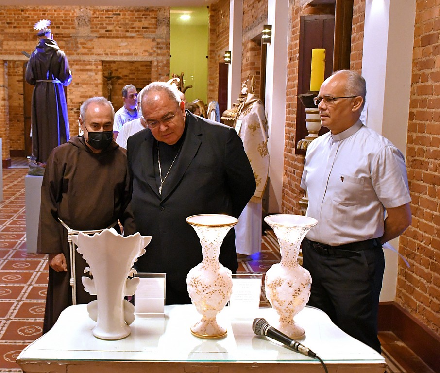 Dom Orani Tempesta observa peças da exposição ao lado do reitor e pároco do Santuário Basílica, frei Jorge de Oliveira, e do diácono Manoel Tavares.
