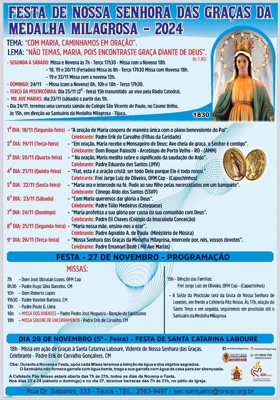 Com o tema “Com Maria, caminhamos em oração”, e o lema “Não temas, Maria, pois encontraste graça diante de Deus” (Lc 1,30), o Santuário da Medalha Milagrosa anuncia o início da Novena de Nossa Senhora das Graças para o dia 18 de novembro, em preparação para a grande festa no dia 27.