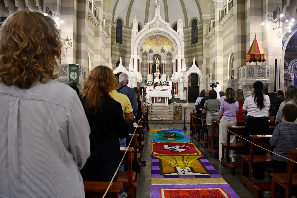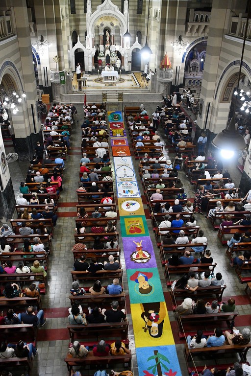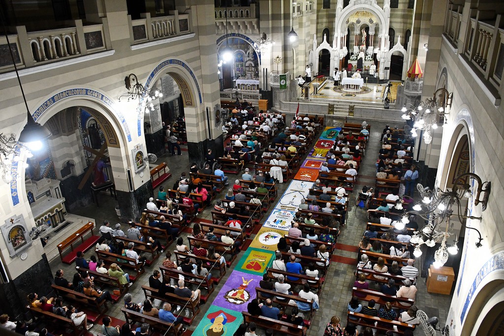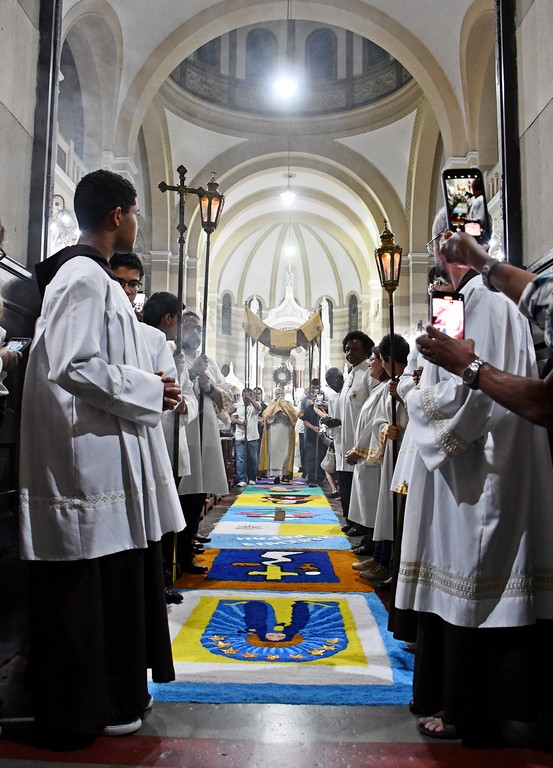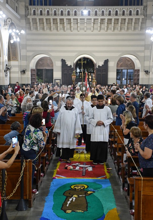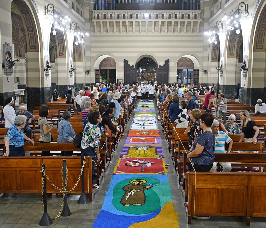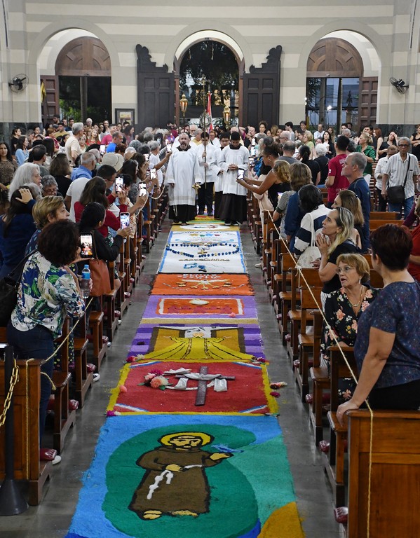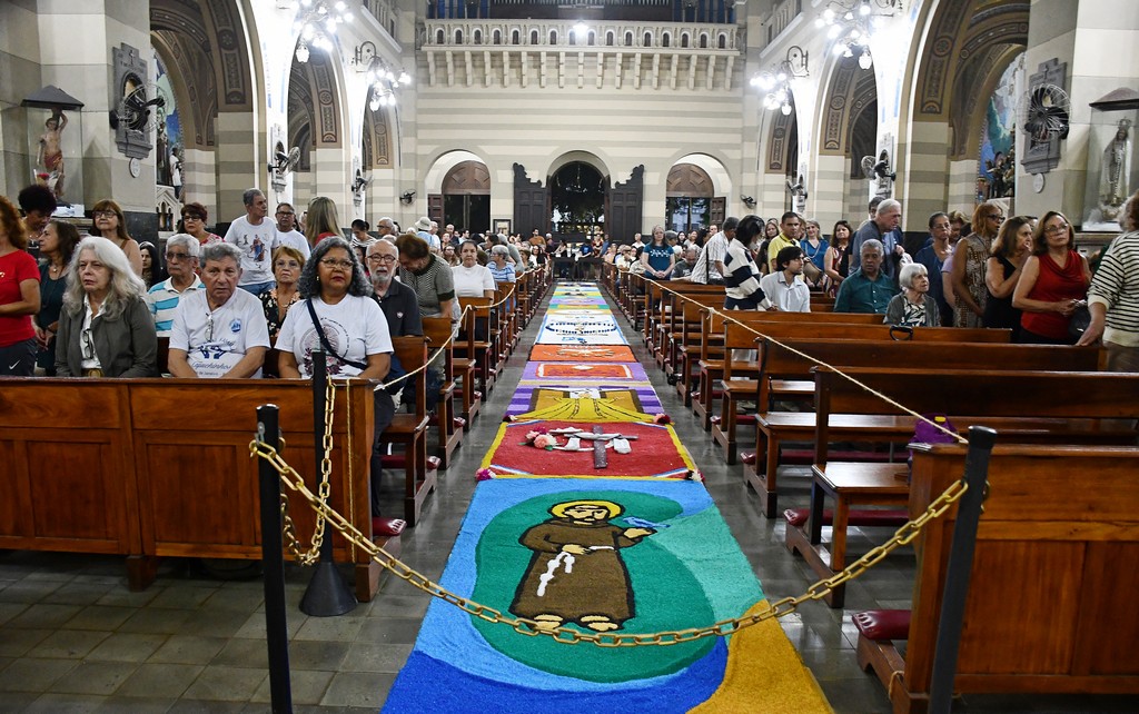 A solenidade de Corpus Christi no Santuário Basílica de São Sebastião, realizada no dia 19 de junho, foi um evento repleto de espiritualidade e beleza. As fotos capturam momentos sublimes, onde fiéis se reuniram em uma celebração de fé e devoção. Os tapetes, cuidadosamente confeccionados por voluntários, adornou o caminho por onde a procissão passou, criando um espetáculo visual que encantou a todos os presentes.