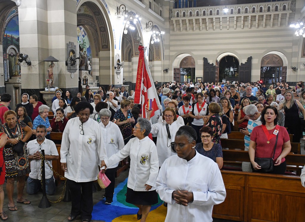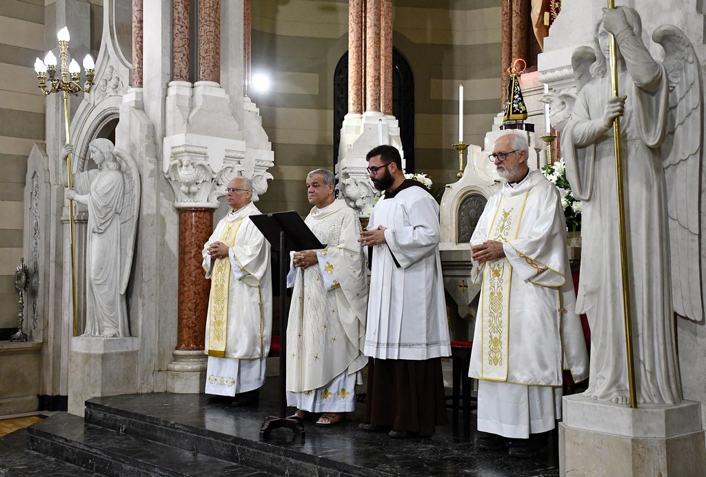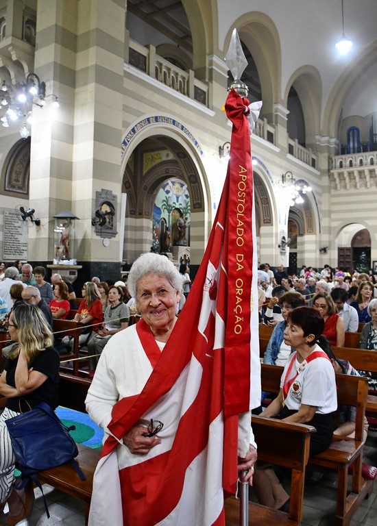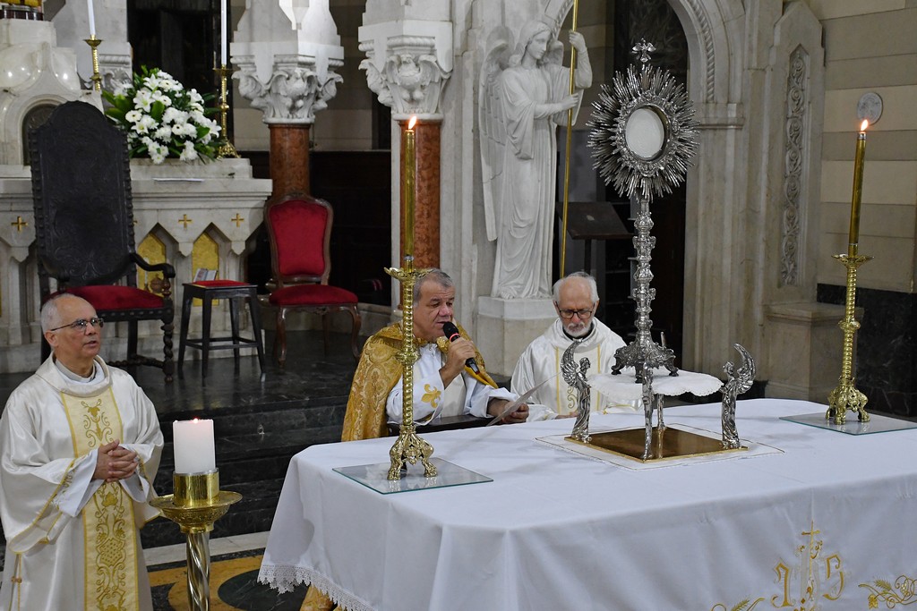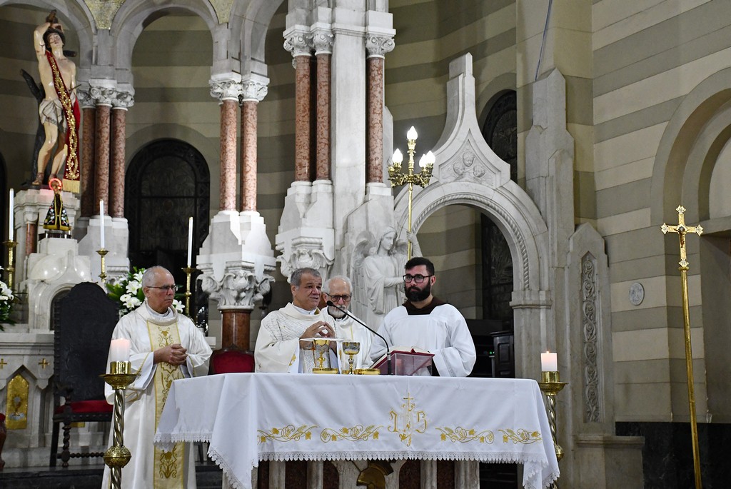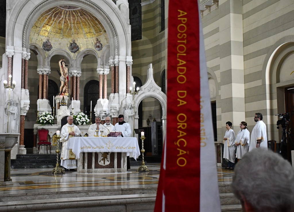 As imagens também mostram a imponência da Basílica, com sua arquitetura majestosa e detalhes que refletem a riqueza da tradição católica. A expressão de serenidade e reverência nos rostos dos participantes revela a profundidade do momento vivido. A solenidade, marcada por cantos litúrgicos e orações, foi uma demonstração de união e esperança, fortalecendo a comunidade e renovando o espírito de todos que participaram.