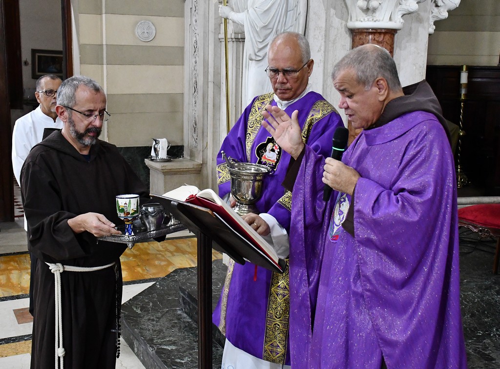 As cinzas, obtidas a partir da queima dos ramos abençoados no Domingo de Ramos do ano anterior, simbolizam a fragilidade humana e a penitência. Acima, Frei Reinaldo de Ávola abençoa as cinzas antes de serem impostas nas testas dos fiéis. | Fotos: Emilton Rocha