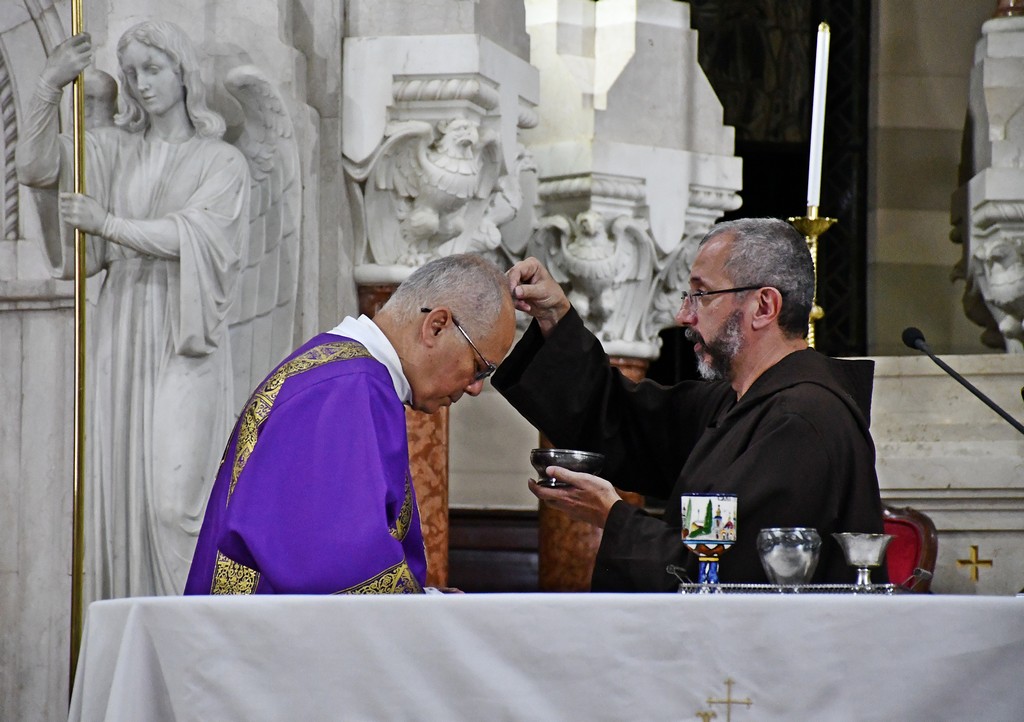 Frei Almir impõe as cinzas na testa do Diácono Manoel, no Santuário Basílica de São Sebastião.