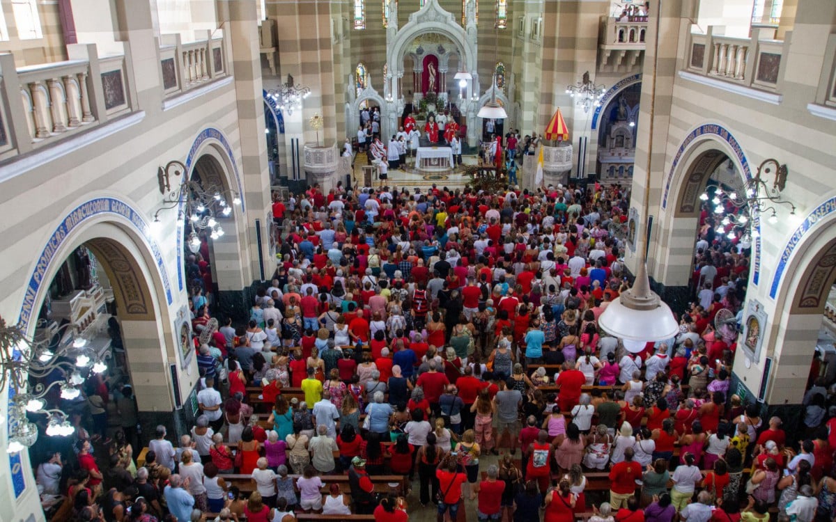 Por cerca das 8 horas, o cortejo já estava formado. Via-se à frente uma grande bandeira dos navegantes portugueses, toda branca tendo ao centro a Cruz de Cristo. Logo após vinham os Escoteiros Católicos, colégios, Irmandades, confrarias, Ordens Terceiras, Clero secular e regular, e a seguir o andor com a imagem do Padroeiro.