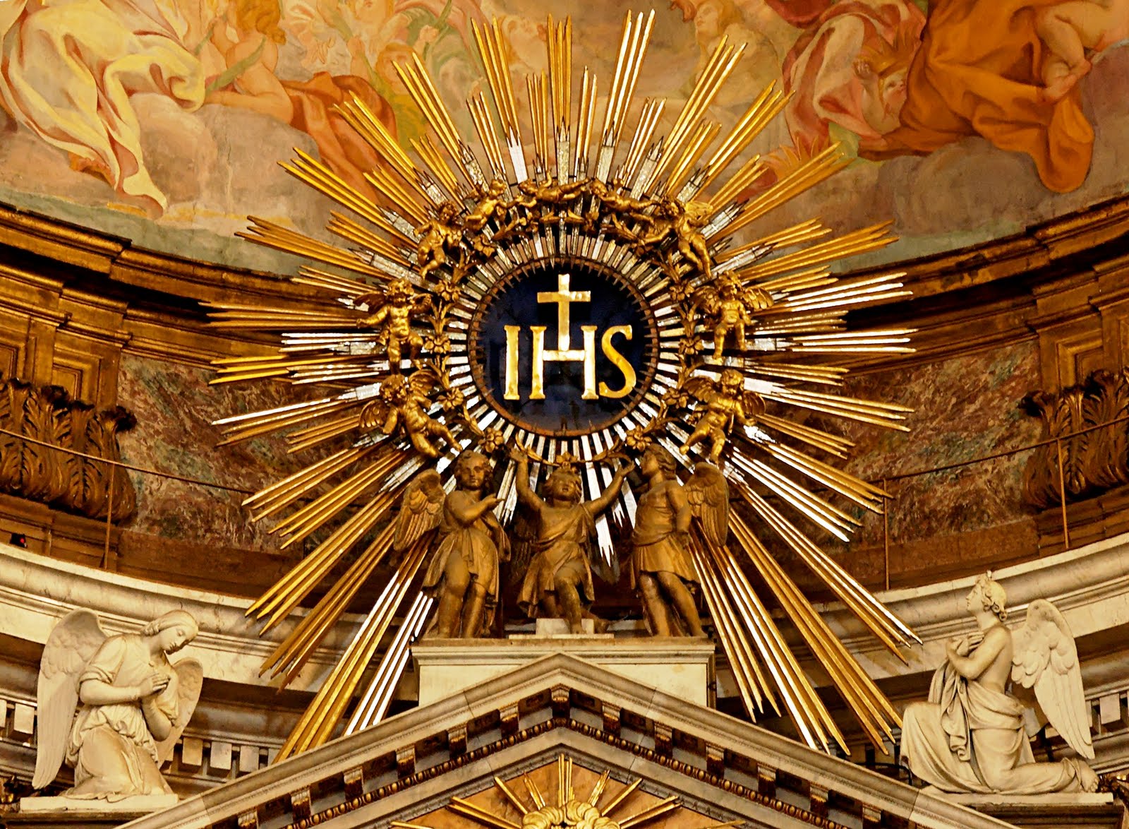 São Bernardino costumava carregar uma pequena imagem que mostrava a Eucaristia com raios saindo dela e, no meio, via-se o monograma “IHS”, abreviação do Nome de Jesus em grego (ιησουσ).
