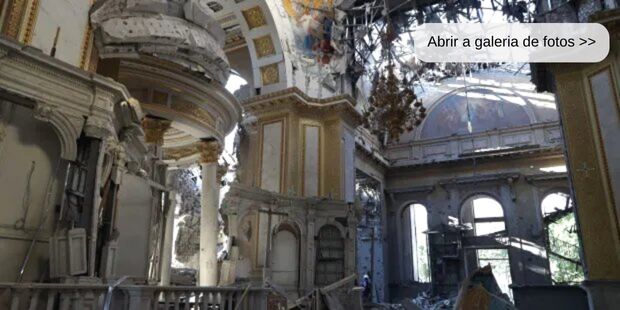 Paredes desmoronadas, lustres frágeis… Na noite de 22 para 23 de julho de 2023, a Catedral Ortodoxa da Transfiguração em Odessa (Ucrânia) foi parcialmente destruída por mísseis russos.