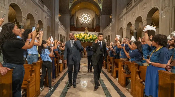 Mais de 6 mil brasileiros participaram da missa de entronização de Nossa Senhora Aparecida na basílica da Imaculada Conceição, em Washington, DC, o maior templo católico dos EUA, no sábado (14).