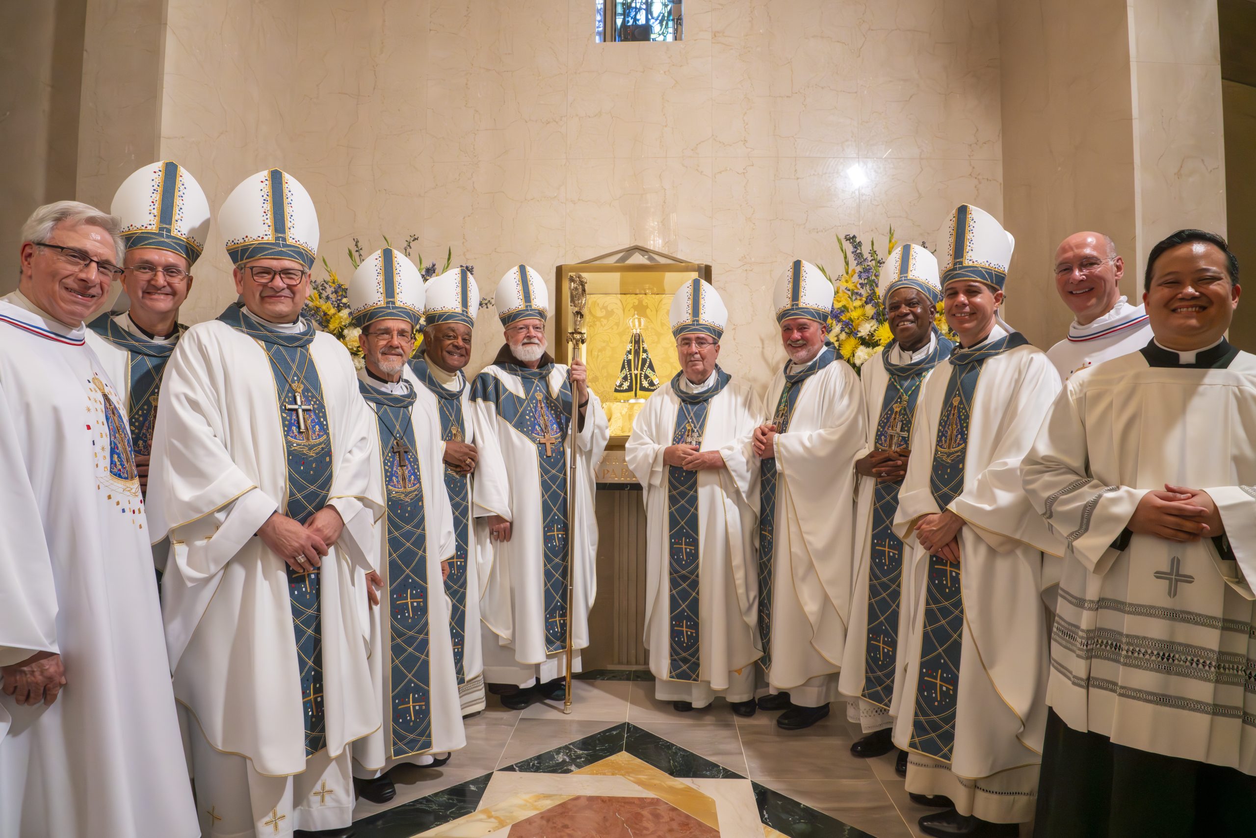 A missa da entronização da imagem de Nossa Senhora Aparecida foi celebrada em português pelo arcebispo emérito de Boston, cardeal Seán O’Malley. O núncio apostólico nos EUA, dom Christophe Pierre, nove bispos e mais de 50 padres concelebraram a missa.
