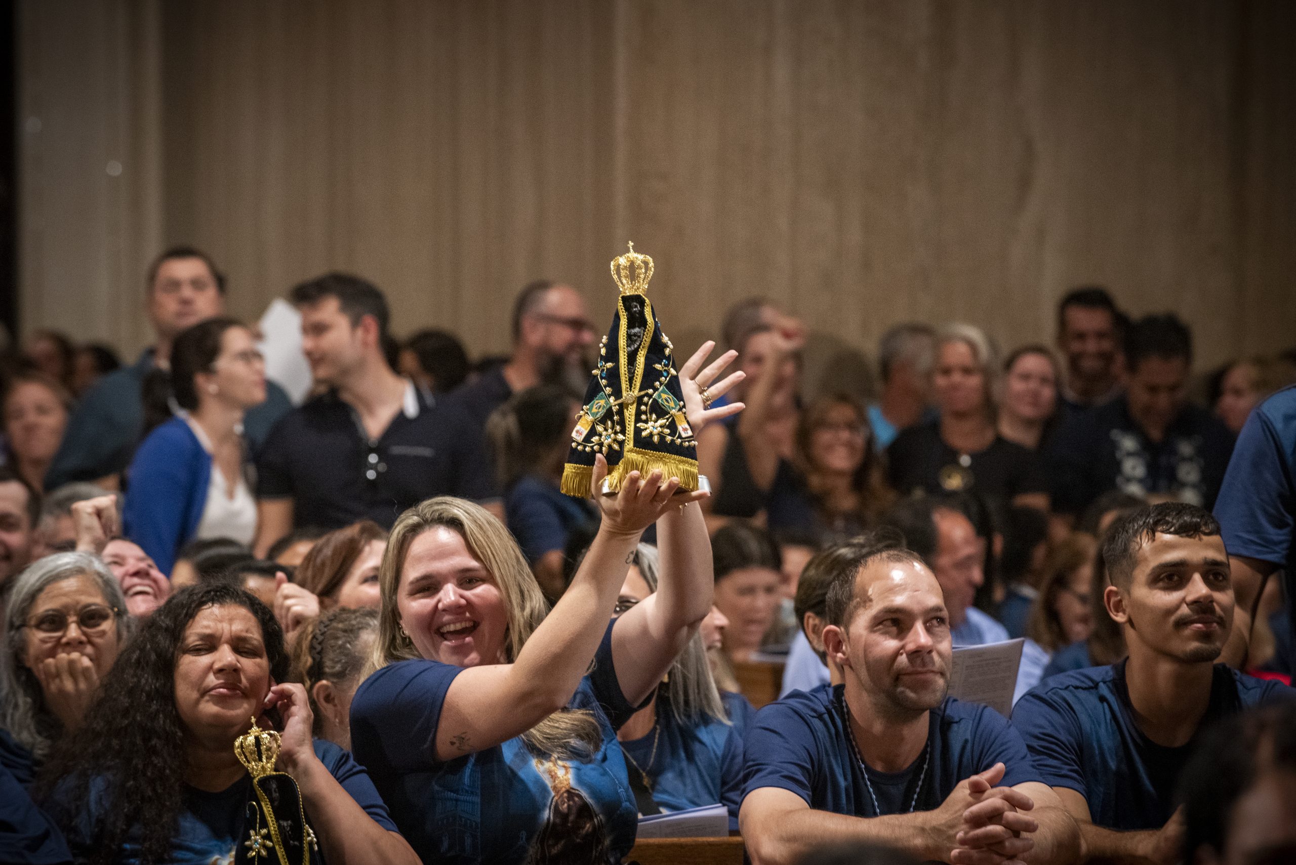A basílica estava lotada, havia muitas pessoas em pé e outras sentadas no chão. A maioria dos participantes vestia uma camiseta azul com a imagem de Nossa Senhora Aparecida, que foi vendida antes do evento como forma para arrecadar dinheiro para os custos da entronização.