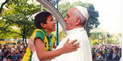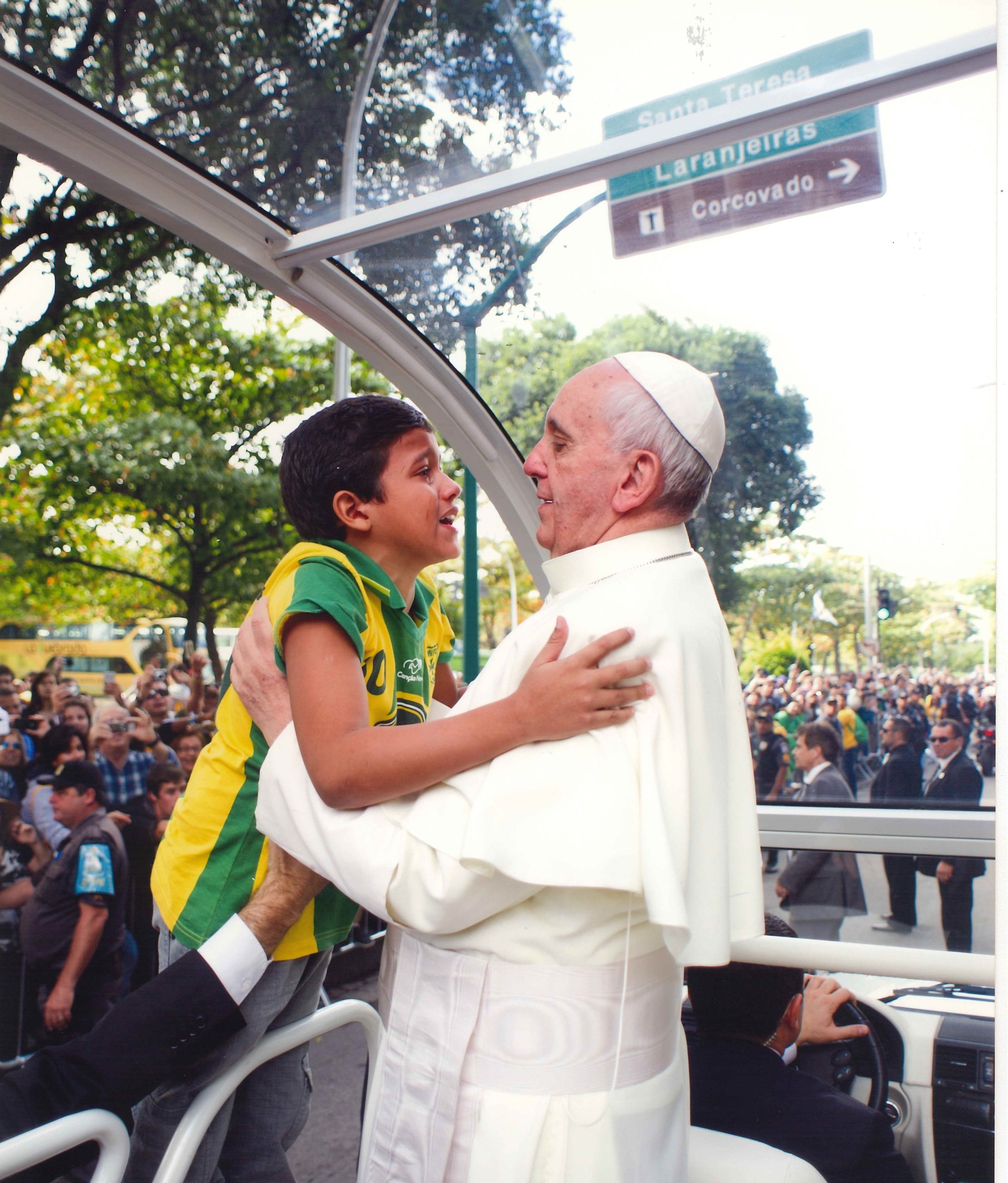 Nathan Pires fura bloqueio de seguranças e recebe abraço do Papa Francisco.Fátima Lima / Testemunho de Fé*