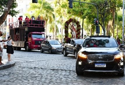 Carreata conduzindo a imagem do santo padroeiro contorna a Praça da Cruz Vermelha, em direção à Catedral de São Sebastião.