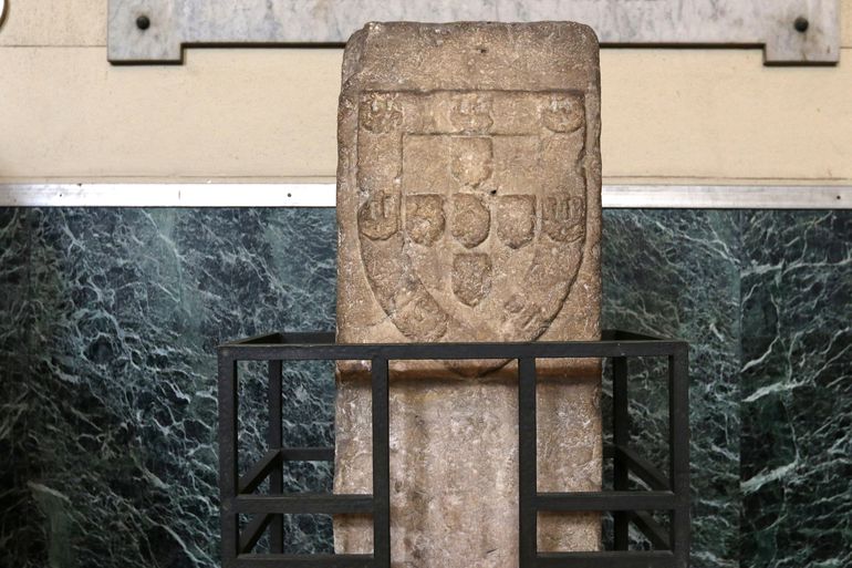 Com cerca de 2m de altura, a coluna de pedra ostenta, nesta face anterior, as armas do Império português — as quinas, que representam os cinco reinos mouros vencidos por D. Afonso Henriques na Batalha de Ourique, travada em 1139; e os sete castelos, símbolo das fortificações conquistadas naquela ocasião. Na face oposta, está a Cruz de Cristo, estandarte da Expansão Marítima lusitana.