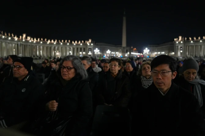 Centenas de pessoas se reúnem para rezar o terço pela saúde do Papa Francisco na quinta-feira, 6 de março de 2025, na Praça de São Pedro, no Vaticano. | Crédito: Daniel Ibañez/CNA