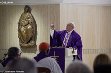 “O pecado é obra de Satanás e Jesus vence Satanás ‘fazendo-Se pecado’ e de lá eleva todos nós. O Crucifixo não é um ornamento, não é uma obra de arte, com tantas pedras preciosas, como se vê por aí: o Crucifixo é o Mistério do ‘aniquilamento’ de Deus, por amor. E aquela serpente que no deserto profetiza a salvação: elevado e quem quer que o olhe será curado. E isso não foi feito com a varinha mágica de um deus que faz coisas: não! Foi feito com o sofrimento do Filho do Homem, com o sofrimento de Jesus Cristo!”.