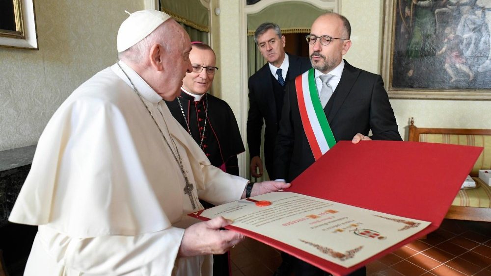 O prefeito, Maurizio Rasero, conferiu ao Papa a cidadania honorária “por seu forte compromisso com a paz no mundo e suas mensagens diárias de solidariedade e fraternidade contra todas as formas de discriminação”, valores também consagrados no Estatuto da Cidade de Asti, e por seus fortes laços com o território de Asti e com o Piemonte, testemunhados pela continuidade dos contatos com sua família e as instituições, simbolicamente representados pela pequena bolsa de terra do local retirada de Bricco Marmorito.
