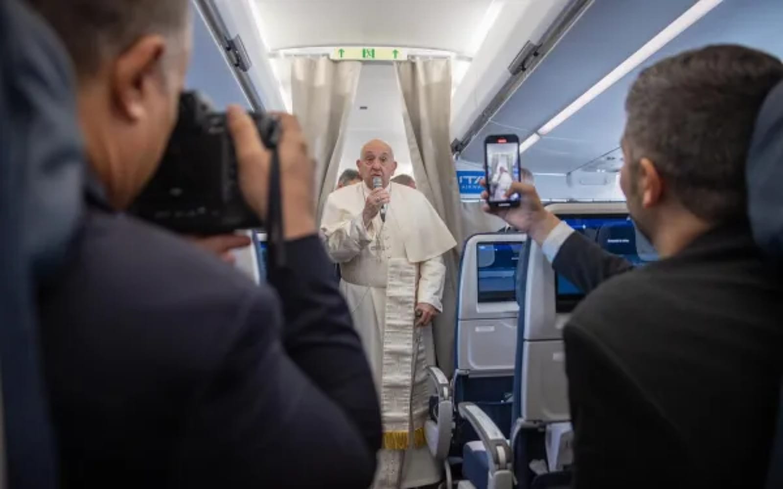 O diretor da Sala de Imprensa da Santa Sé, Matteo Bruni, disse que o fato do papa Francisco não ter cumprimentado os jornalistas “não se deve ao seu estado de saúde, mas porque é um voo muito curto e não houve tempo”.