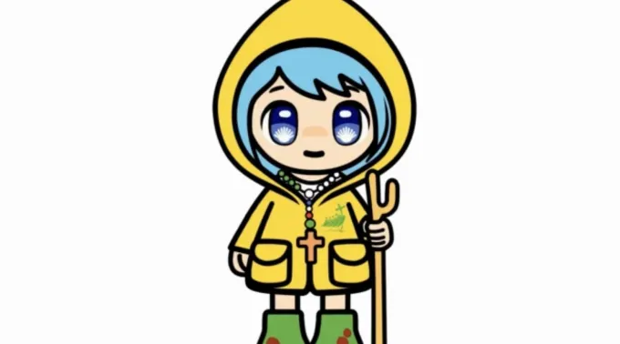 Vestida com uma capa de chuva amarela, botas manchadas de lama e uma cruz de peregrino, a missão de Luce é guiar jovens peregrinos em direção à esperança e à fé com seu fiel cão Santino ao seu lado. Conchas brilham em seus olhos, lembrando a concha de vieira do caminho de Santiago, um símbolo da jornada de peregrinação.