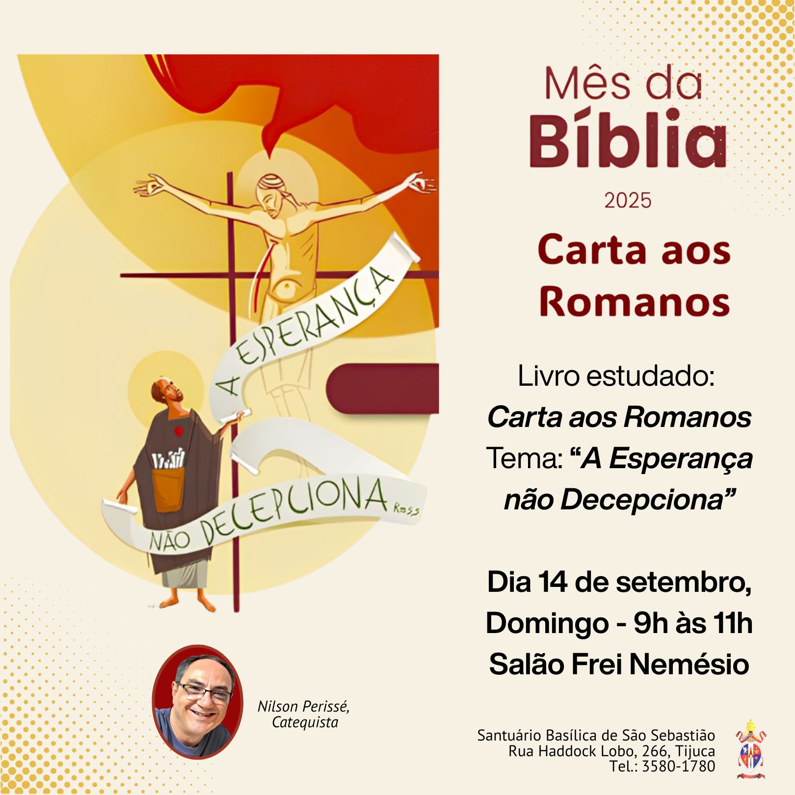 No dia 14 de setembro, domingo, das 9h às 11h, será realizada uma palestra com o catequista Nilson Perissé no Salão Frei Nemésio, no Santuário Basílica de São Sebastião, na Tijuca, RJ. O encontro abordará o livro estudado, Carta aos Romanos, com o tema “A Esperança não Decepciona”, trazendo reflexões sobre a mensagem de esperança presente na Escritura e sua aplicação na vida cotidiana. A iniciativa faz parte das atividades do Mês da Bíblia 2025, promovendo a leitura, o estudo e a vivência da Palavra de Deus nas comunidades. Participe e fortaleça sua fé através da Palavra de Deus!