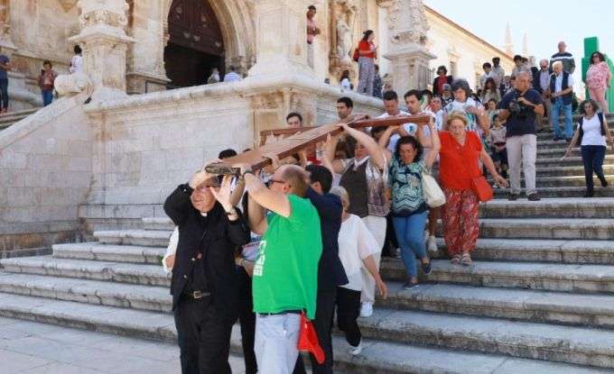 Após a missa, o cardeal Manuel Clemente se juntou a alguns jovens para carregar a cruz por algumas ruas de Alcobaça. Passaram pelo mercado e pela Câmara Municipal. Depois, subiram em um carro panorâmico, rumo ao destino seguinte.