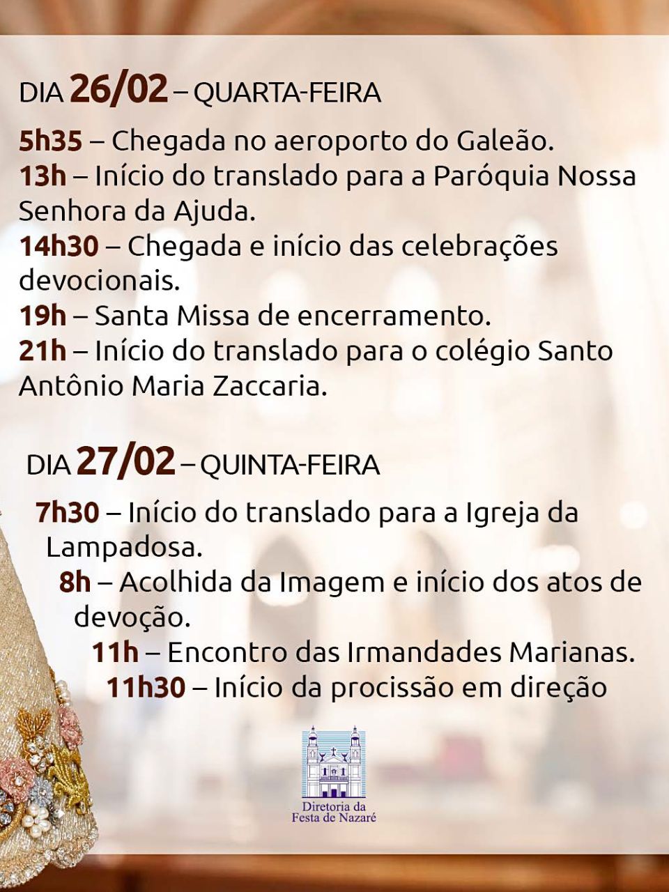 A imagem peregrina chegará no Aeroporto do Galeão no dia 26 de fevereiro, às 5h35, sendo acolhida pelo cônego Cláudio dos Santos, vigário episcopal de Pastoral. A primeira visita, às 14h30, é na Paróquia Nossa Senhora da Ajuda, na Ilha do Governador, encerrando com missa, às 19h, presidida pelo padre Diogo dos Santos Espagolla.