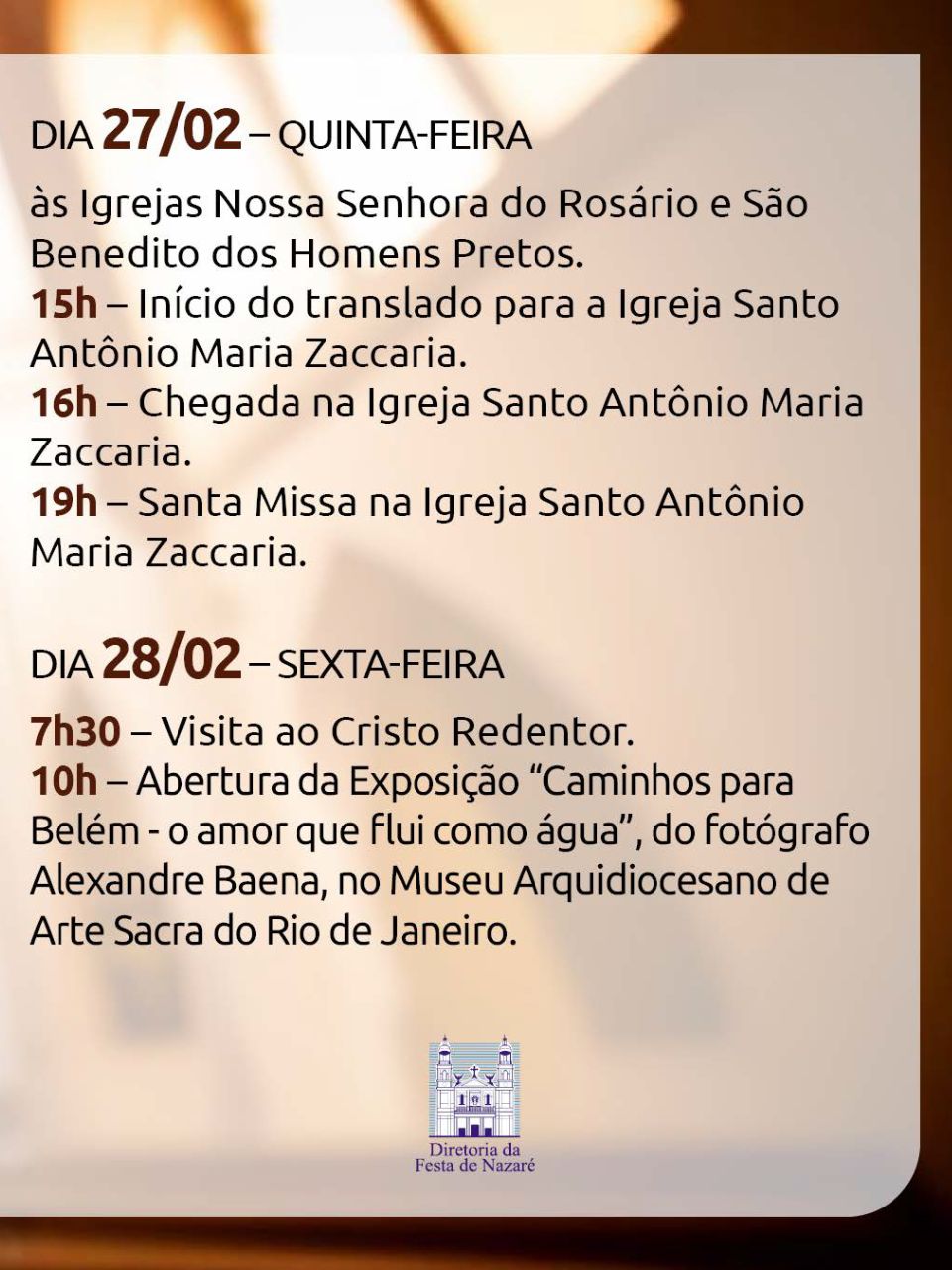 Logo de manhã, às 7h30, a imagem de Nossa Senhora de Nazaré estará para um momento de oração mariana no Santuário Cristo Redentor, no Corcovado. Às 10h, haverá a abertura da Exposição “Caminhos para Belém – o amor que flui como água”, com imagens do fotógrafo Alexandre Baena, no Museu Arquidiocesano de Arte Sacra do Rio de Janeiro, situado no subsolo da Catedral de São Sebastião, no Centro.