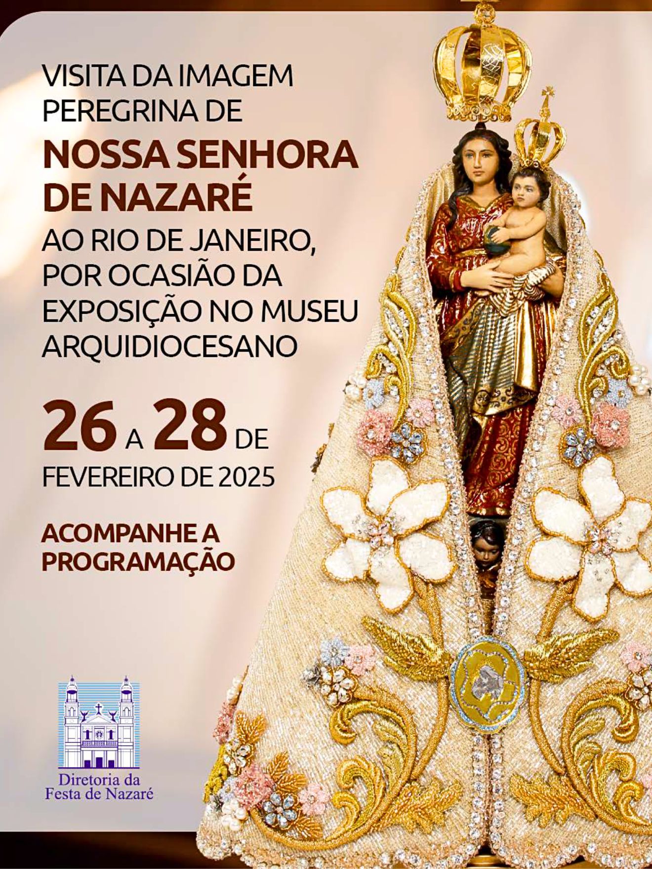 A Arquidiocese do Rio de Janeiro receberá de 26 a 28 de fevereiro a imagem peregrina de Nossa Senhora de Nazaré, vinda de Belém do Pará. Será a segunda visita oficial da imagem em outras capitais do Brasil, neste ano de 2025, dentro da programação da Diretoria da Festa de Nazaré para levar o Círio de Nazaré e a devoção a Nossa Senhora de Nazaré.